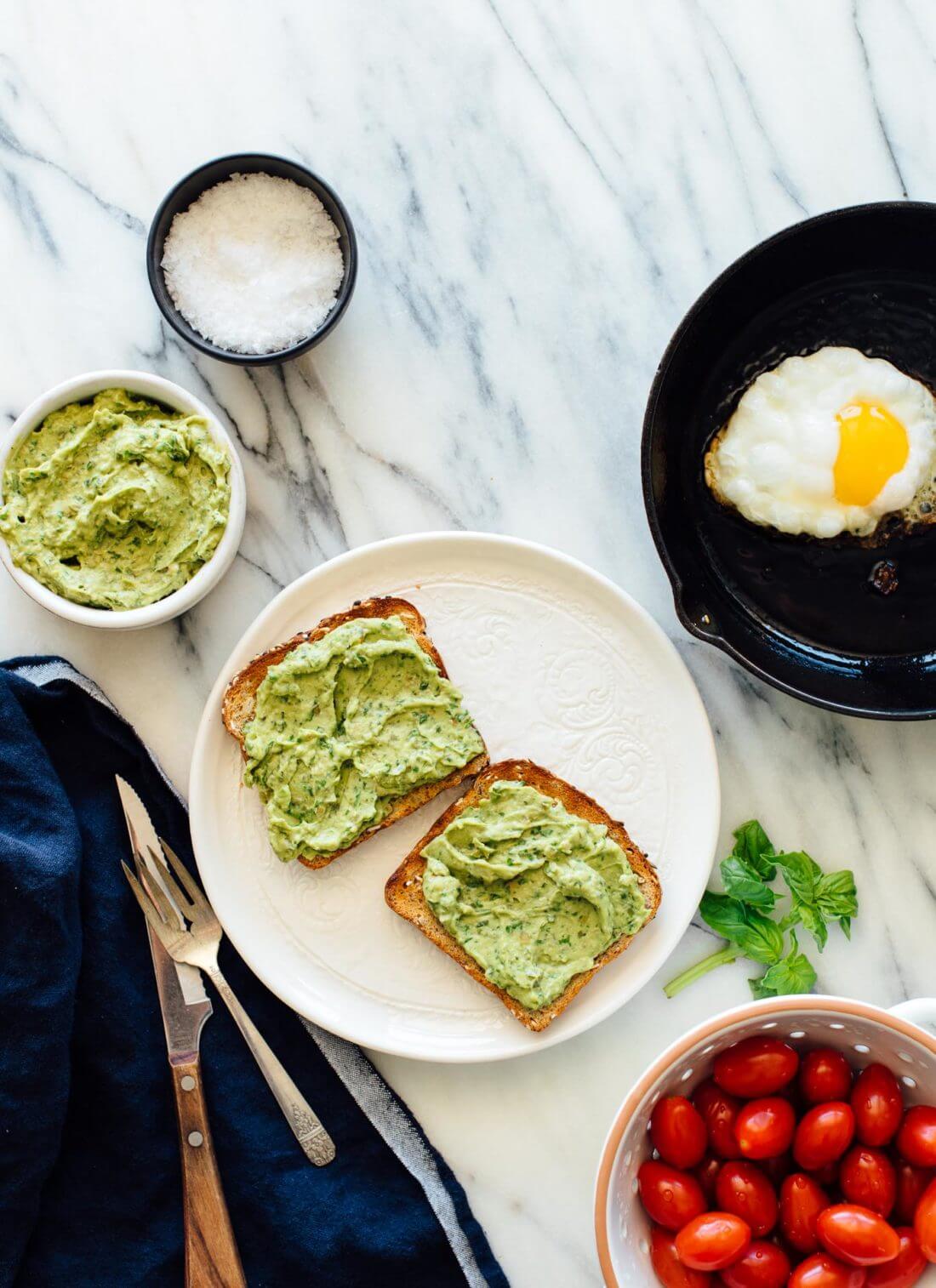 Iโve been thinking about the standard egg-and-toast brunch option and came up with my own version that is neither bland nor boring. I whipped up an avocado-based pesto in my food processor. Itโs infinitely more exciting than a pat of butter (sorry, butter!).