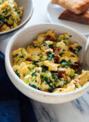 Change it up: The goat cheese is essential, but you can easily omit the other mix-ins (spinach, green onion and sun-dried tomatoes) for more simple eggs. You could replace the spinach with baby arugula, or fold in any prepared vegetables at the end. Fresh, leafy herbs would be nice here, such as basil, dill, parsley or cilantro.