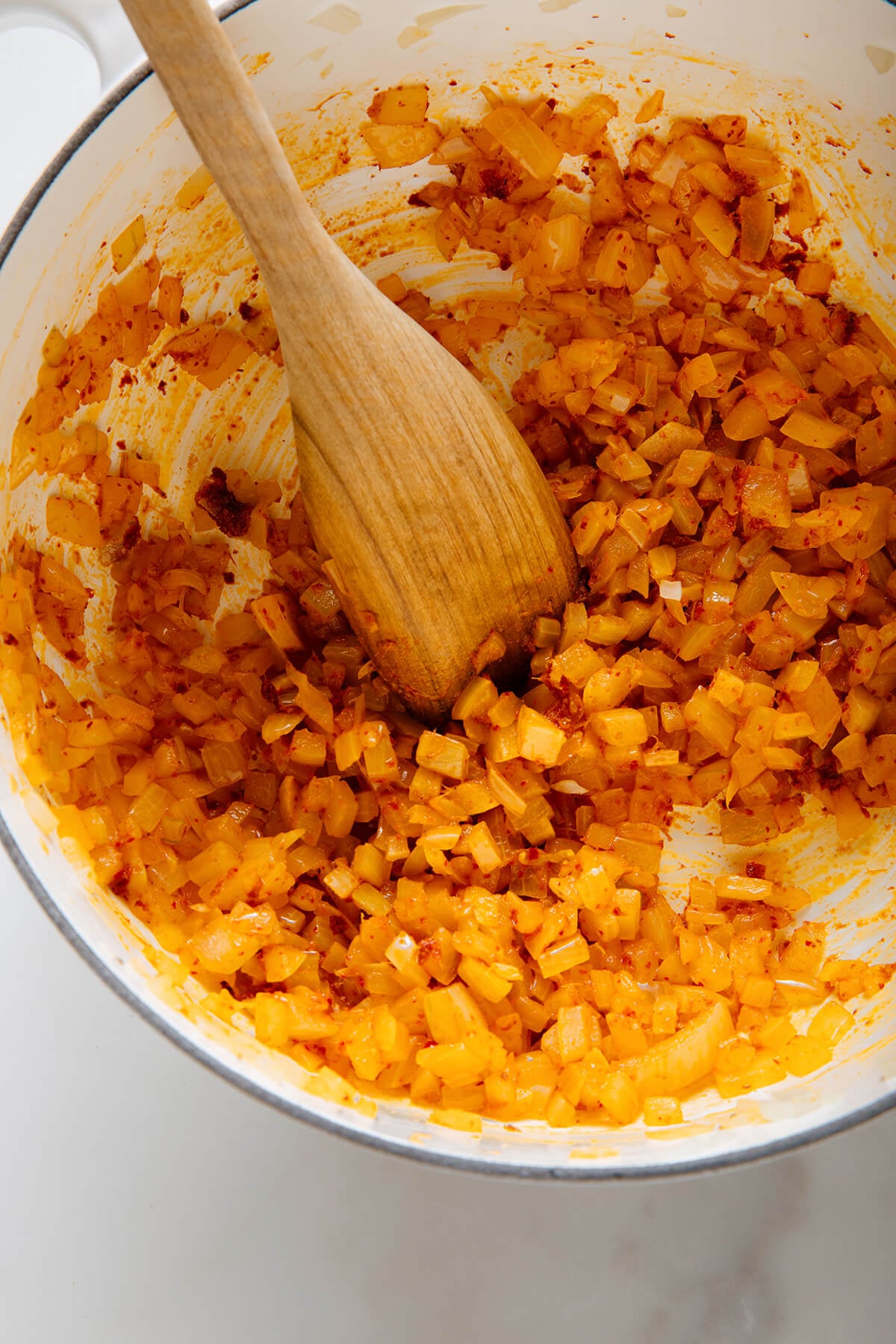- Wait until the cauliflower is done before starting the soup (this is a good time to prep the remaining ingredients). In a Dutch oven or large, heavy-bottomed pot over medium heat, warm 1 tablespoon of the oil until shimmering. Add the onion and a pinch of salt. Cook, stirring occasionally, until the onion is turning translucent, about 3 to 4 minutes. Add the curry paste and lemon zest and stir to incorporate. If youโre using the wine, raise the heat to medium-high, pour it in, and cook, stirring frequently, until most of the wine has evaporated.
