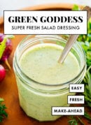 This homemade green goddess dressing recipe is so easy to make! It’s creamy, fresh, completely delicious—and a great way to use up your leafy herbs. Recipe yields about 1 ¼ cups dressing; multiply if desired.