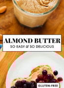 Homemade almond butter is healthy, affordable and even more delicious than store-bought! It’s easy to make, too. You’ll just need a good food processor or blender. Recipe yields about 1 ⅔ cup almond butter (that’s 16 ounces, the equivalent of a jar of almond butter from the store).