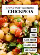 These marinated chickpeas are a little spicy, a little sweet, and totally irresistible. This recipe as great on its own as a light meal or appetizer, or served on salads or inside pitas.