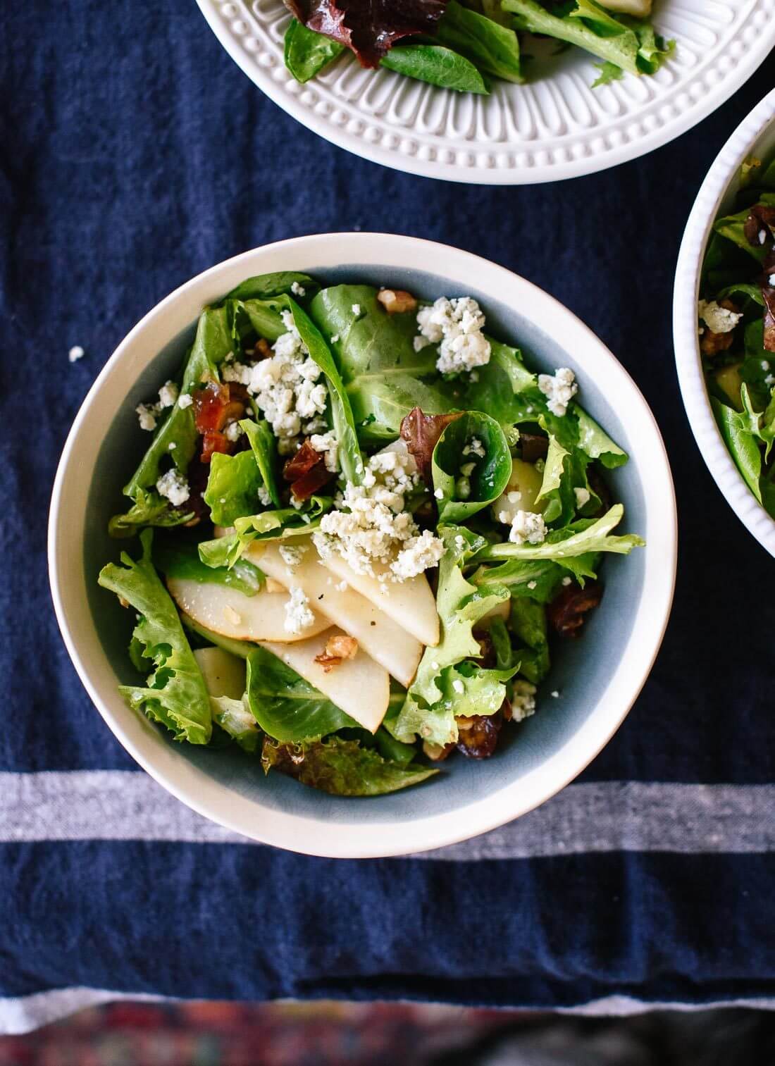 This salad recipe features leafy greens, ripe pear, freshly toasted walnuts, blue cheese (or goat cheese), and dates tossed in a simple homemade vinaigrette. Itโs a fun alternative to my favorite green salad with apples.