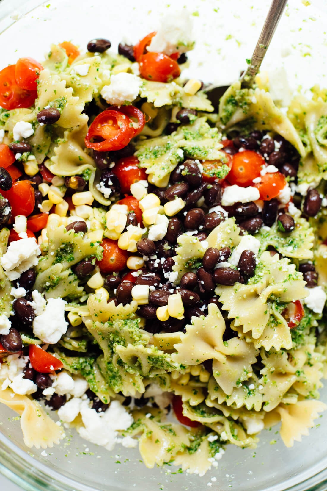 This healthy pasta salad features bold summer flavors, including tomatoes, corn and black beans tossed in spicy, fresh pesto! Itโs a great vegetarian side dish for potlucks and barbecues. See paragraph above for variations and substitution suggestions! Recipe yields about 8 cups salad, which is enough for 4 main or 8 side servings.