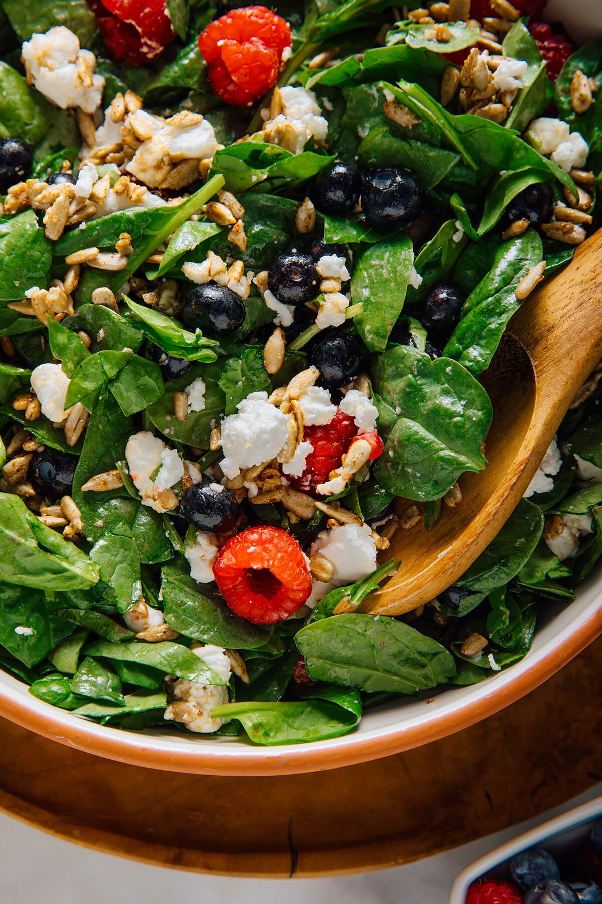 This salad features fresh raspberries, blueberries, spinach and goat cheese. Tossed in homemade balsamic vinaigrette, itโs the perfect spring and summer side salad! Recipe yields 4 side salads, so multiply the recipe if youโre serving a crowd. The spinach wilts quickly once it comes into contact with vinaigrette, so store the two separately until youโre ready to eat.