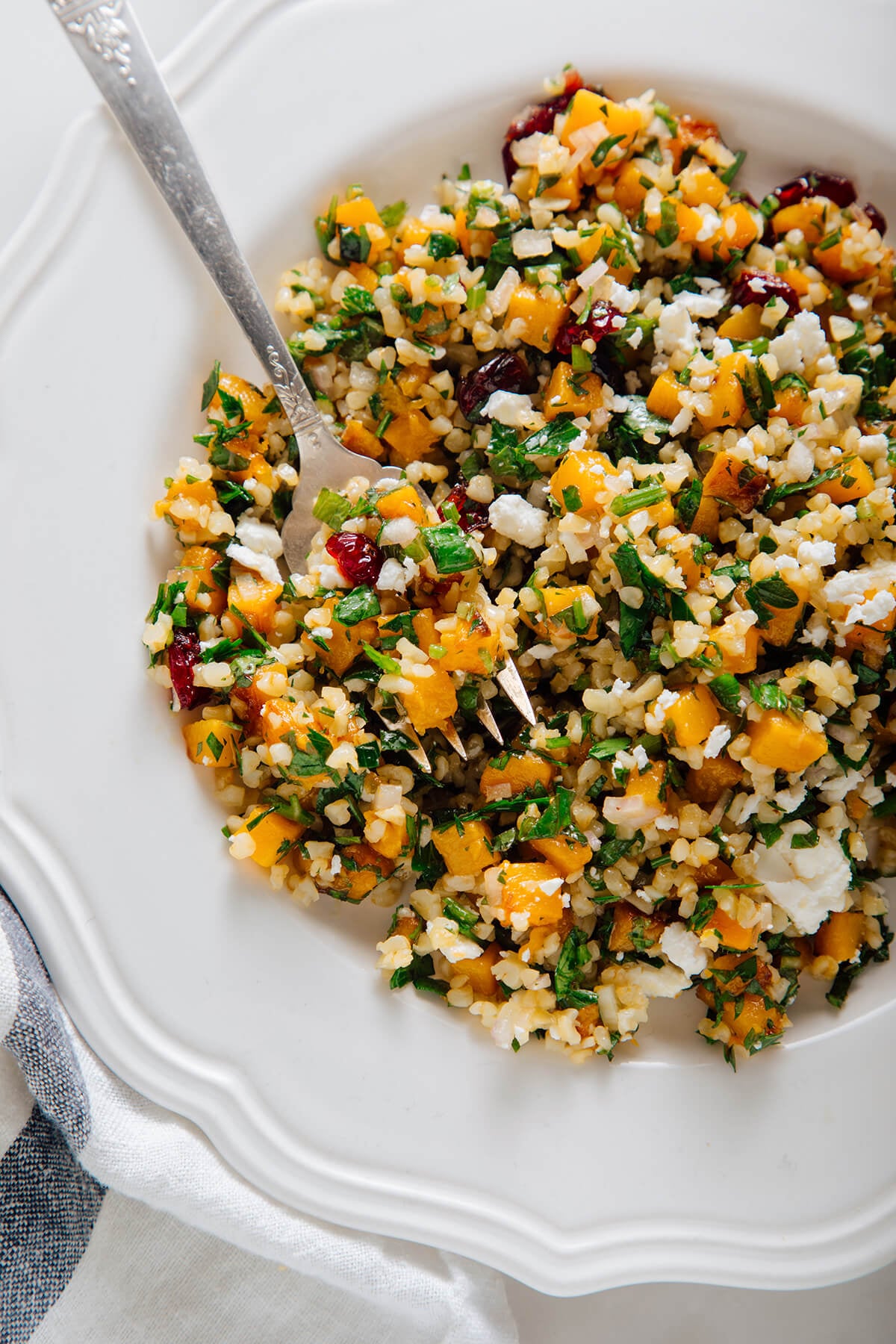 This fresh winter tabbouleh salad recipe features butternut squash instead of tomatoes, along with some dried cranberries for complementary flavor. This recipe yields 4 side salads.