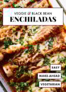 These vegetarian enchiladas are a hearty and satisfying dinner. Make them on a weeknight and youโll enjoy leftovers for lunch the next day. Or make it on the weekend and invite friends over to make a party out of it! You could make a double batch and freeze the extrasโyouโll find freezing instructions below.